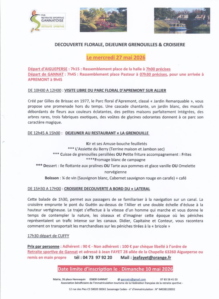 Prix par personne : Adhérent 90 € – Non adhérent 100 €. Chèque libellé à l’ordre de RETRAITE SPORTIVE DE GANNAT, adressé à Jean FAYET – 28 Allée de la Chapelle – 63260 Aigueperse ou remis en main propre. Tél 04 73 97 92 20 – Mail : jeafayet@orange.fr